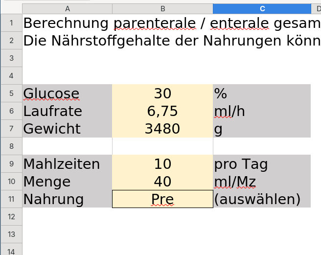 Bei der oft tagelangen Therapie ist es hilfreich, die Gesamt-Glukosezufuhr in mg/kg/min oder auch g/kg/d zu berechnen, um die Infusionstherapie besser anpassen zu können. Zum Beispiel stellt sich ja oft die Frage, ob ein zentraler Zugang für Infusionen mit mehr als 12,5% Glucoseanteil noch weiterhin notwendig ist oder ob auch ein peripherer Zugang mit geringer konzentrierter Infusion genügt, wenn dadurch nicht zu viel Flüssigkeit notwendig ist. Außerdem hilft es beim täglichen Justieren der Therapie, den iv- und den enteral-Anteil der Gesamt-Glukosezufuhr zu kennen. Dazu habe ich einen kleinen Excel-Rechner gebastelt, der das ganz einfach übernimmt wenn man die entsprechenden Parameter eingibt (Glucoseinfusion, Laufrate, Geburtsgewicht, Mahlzeitenanzahl/-menge und Nahrung). Siehe Unterseite Medizin.